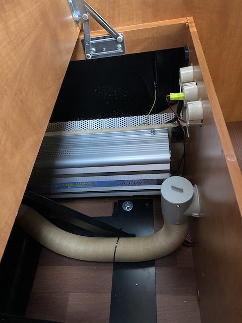 Der Wandler wurde an einem neuen Brett fest montiert. Die Verkabelung zur Batterie wurde durch das Staufach unterm Tisch zum Fahrersitz gelegt.