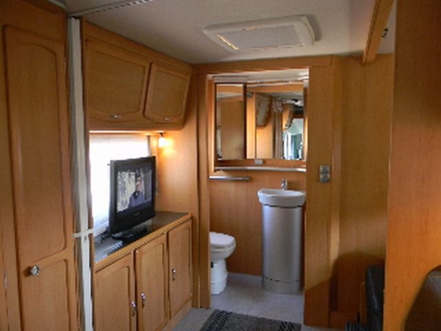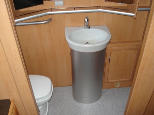 Das Badezimmer geht über die gesamte Breite des Fahrzeuges.