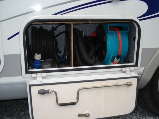 - Frankia Service Fach mit fest eingebautem Abwasserschlauch / Frischwasserschlauch und Kabeltrommel