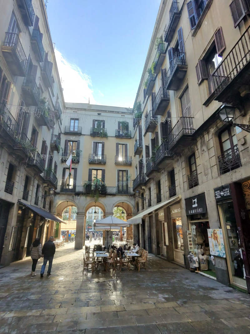 Besonders schön sind die vielen kleinen Plätze, die plötzlich zwischen den Häusern auftauchen. Ein paar Bäume, ein Brunnen, Cafétische im Schatten – perfekte Orte zum Verweilen und Beobachten. Barcelona zeigt hier seine entspannte, lebensfrohe Seite: laut, bunt, aber nie hektisch.
