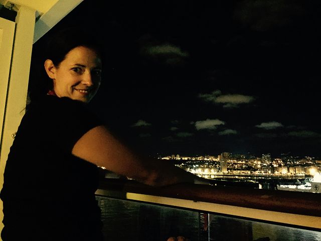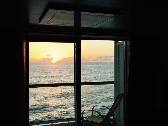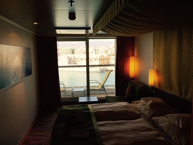 Um 12 Uhr konnten wir dann das erste Mal eine Balkon Kabine die unsere für die kommenden 7 Tage nennen. Der Balkon ist schon sehr klein, zwei Stühle und ein kleiner Hocker haben Platz, aber tolle Aussicht.