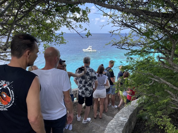Erster Halt war ein Supermarkt, an dem wir die Möglichkeit bekamen Getränke für den Tag einzukaufen. Nach kurzer Zeit ging es weiter in ein Villenviertel, bei dem wir auch einen Blick auf Klein Bonaire werfen konnten. Mandy erzählte etwas über die Flora und Fauna der Insel. Nach wenigen Minuten ging es zur Treppe der 1000 Stufen. Die Treppe wird so genannt, da am Ende der Treppe ein tolles Tauchgebiet ist und die Taucher diese Treppe herunter müssen. Natürlich sind es keine 1000 Stufen, sondern die Taucher haben beim Aufstieg das Gefühl das diese Treppe nie enden wird.