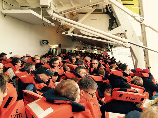 Das Schiff war ausgebucht, was wir bei der Seenotrettungsübung merken.