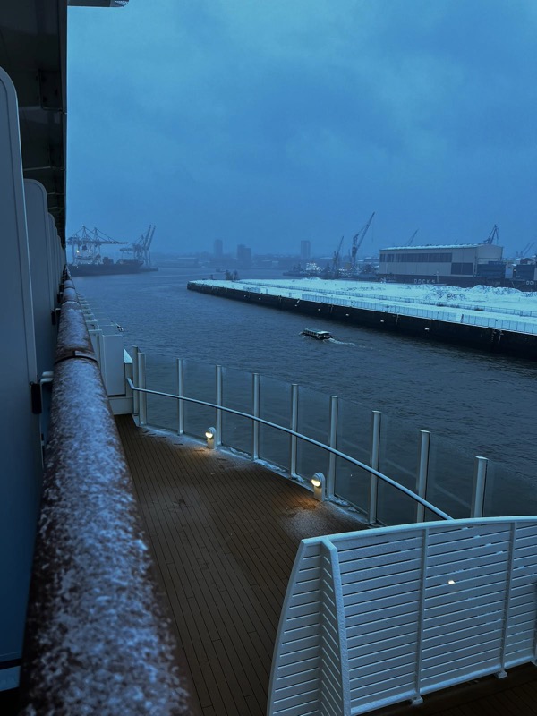 Im Januar 2024 ging es wieder mit der AIDA auf Metropolen-Tour. Mit dem PKW ging es von Hannover nach Hamburg. Vorab hatten wir schon einen Parkplatz über "Parken und Meer" inklusive Shuttle-Service gebucht. Hamburg begrüßte uns mit Schnee, was doch sehr selten in Hamburg vorkommt. Schnell erfolgte der Check-In und kurze Zeit später erreichten wir unsere Kabine, ein Willkommensgruß stand schon bereit.