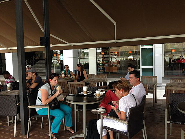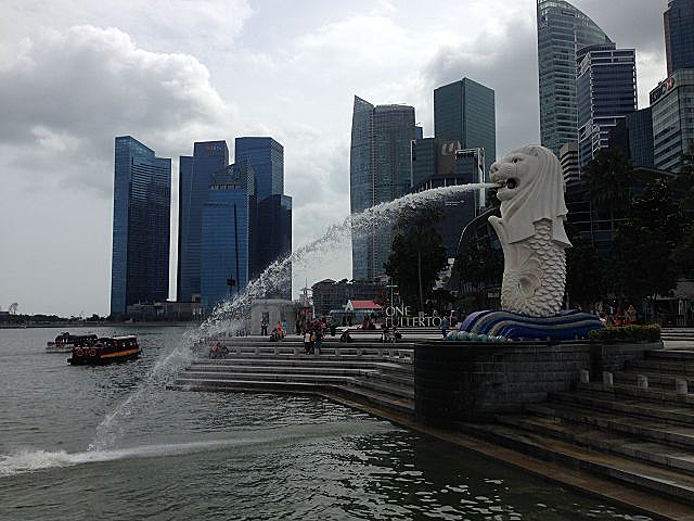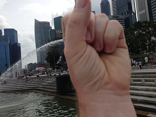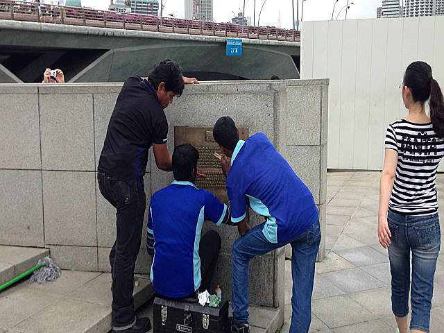 Nach einem ausgiebigen Spaziergang durch die Welt wechselten wir die Linie. Nun ging es mit der braunen Linie von der Selegie Road zum Wahrzeichen von Singapur, den Merlion Park. An allen Ecken wird geputzt, notfalls auch mit der Zahnbürste. Endlich etwas Ruhe beim Kaffee. Der Vorteil vom Starbucks ist der kostenlose WIFI Zugang ins Internet.