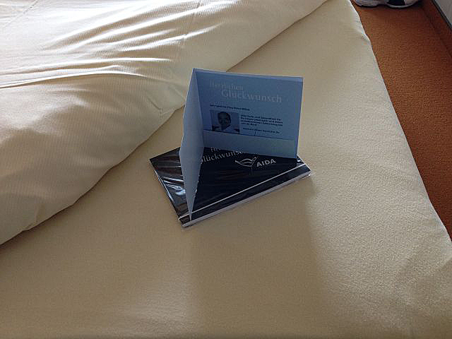 Ein Stück als Nachspeise und wir waren schon pappsatt. Auf der Kabine angekommen wartete schon die nächste kleine Geburtstagsüberraschung, ein Geschenk vom Club-Direktor, Zimmer hübsch Hergerichtet und eine Geburtstagskarte.