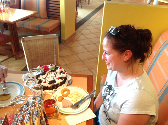 Unser Frühstück erhielten wir im Restaurant Rossini. Anja und Matthias hatten uns an dem besonderen Tag von Petra eingeladen und es war ein richtiges Highlight. Essen wird frisch auf Bestellung zubereitet und am Tisch serviert. Die Kellner wussten natürlich vom Geburtstag und kamen mit einer Geburtstagstorte an.