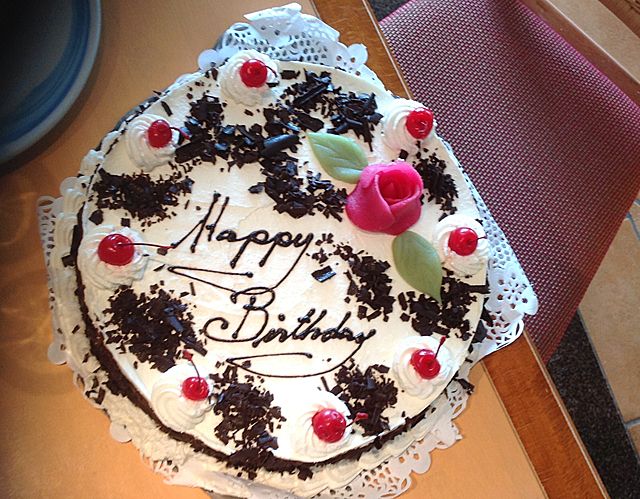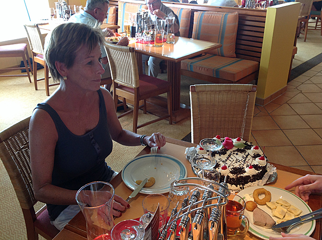 Nach einem tollen Vormittag am Sonnendeck gingen wir um 12 Uhr ins Marktrestaurant und dort wartete schon die nächste Überraschung auf Petra. Sabine und Hajo hatten eine Geburtstagstorte für Petra geordert die vom Restaurant-Chef persönlich übergeben wurde.
