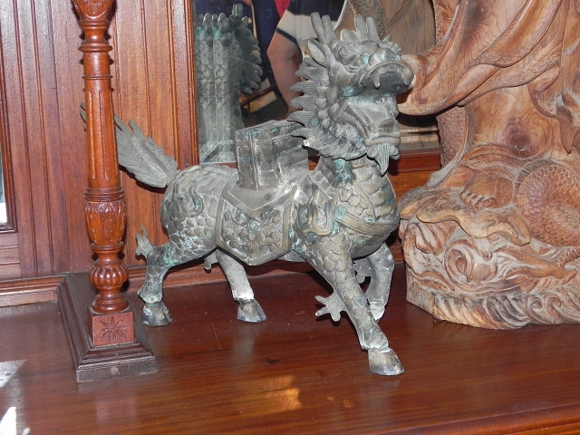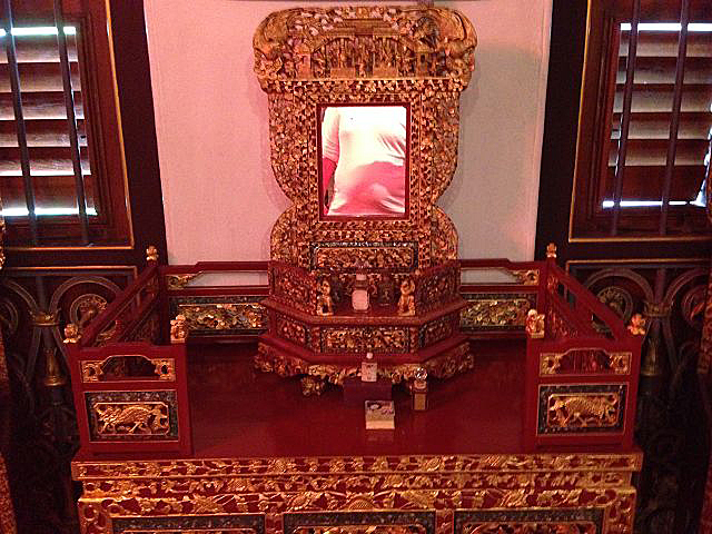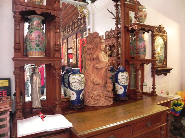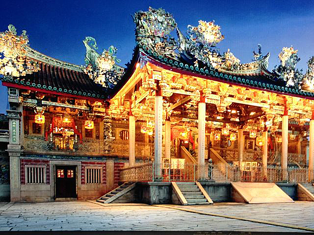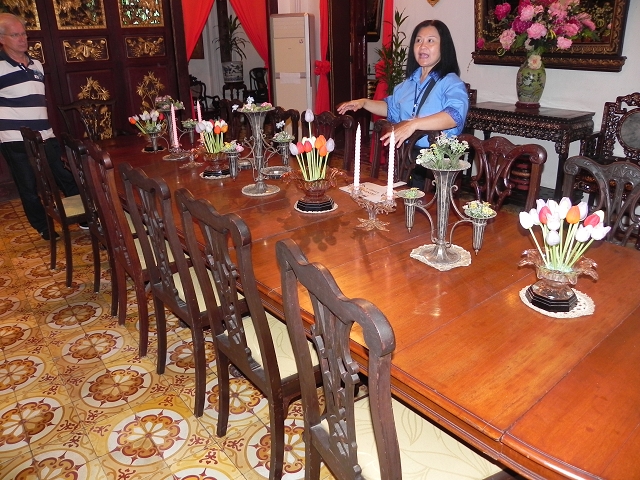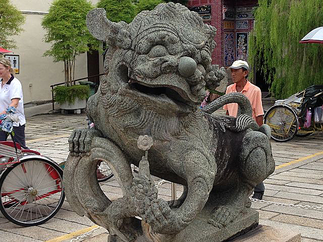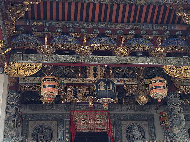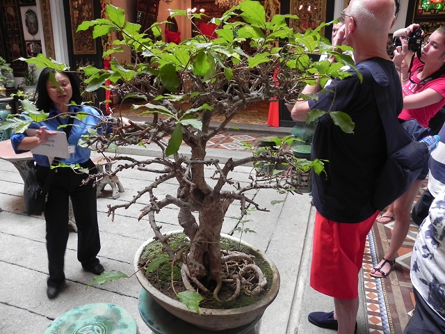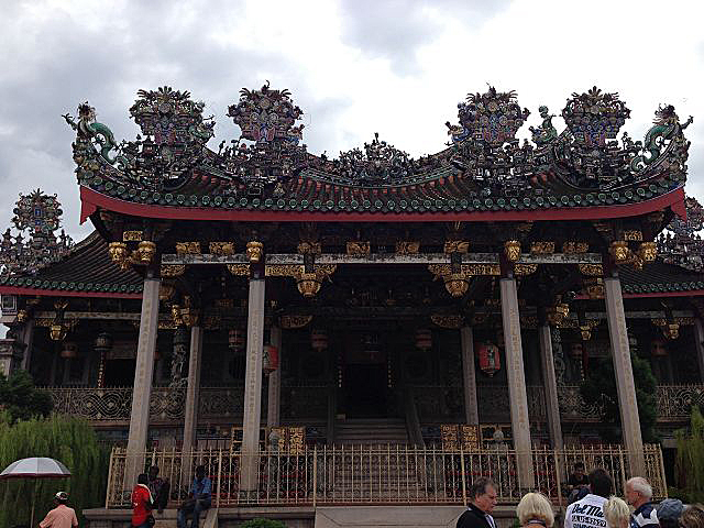 Um 10:30 Uhr ging es vom Schiff und am Pier standen schon Einheimische in den traditionellen Trachten als Willkommensgruß bereit. Kurz durch das Hafenterminal und schon waren wir bei den Fahrradtaxen angekommen, die schon für uns bereit standen. Nicht abschrecken lassen von dem Hinweis auf dem Ticket, dass eine Person max. 90 kg wiegen dürfte. Die Trishaw sind für europäische Verhältnisse sehr eng, so dass zwei Personen eigentlich kaum Platz haben. Da dieses bekannt ist, werden extra mehr Fahrradtaxen geordert, so dass einige ein Trishaw alleine nutzen. Los ging es durch die Straßen von Georgetown, entlang den engen Gassen und den zweistöckigen Shop Houses. In diesen Häusern wohnt eine komplette Familie, untern wird gearbeitet und oben gewohnt. Unsere erste Station erreichten wir nach ca. 25 Minuten, das Leong santong khoo kongsi, eine alte traditionelle Chinesische Schule. Beeindruckende Verzierungen überall wohin man schaute. Unser englischsprachiger Guide erklärte alles sehr gut und ausführlich.