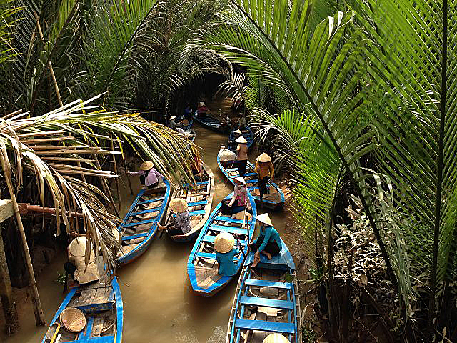 20 Minuten später erreichten wir nun die Insel, aussteigen und weiter ging es zu einer Kokosnussfabrik. Naja, Fabrik ist vielleicht etwas übertrieben, aber seht selber auf den Bildern. Typisch für Vietnam sind die vielen Hängematten, die überall zu sehen sind. Sogar in den Restaurants und den Kaffees sind diese zu finden. Ein Gast kann sich für ein / zwei Stunden hinlegen und ausruhen. Nach unserer beeindruckenden Vorführung der Herstellung von Kokosnussbonbons (welche man auch erwerben konnte) ging es weiter zur unserer nächsten Bootstour, eine Kanufahrt auf einem Nebenfluss des Mekong. Zwei einheimische Frauen ruderten uns durch einem Seitenarm.