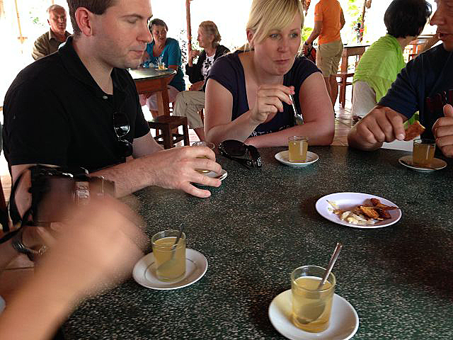 Auf der Insel, mitten im Urwald, wartete schon das Mittagessen mit Livemusik auf uns. Frisches Obst und Tee standen auf dem Speiseplan.