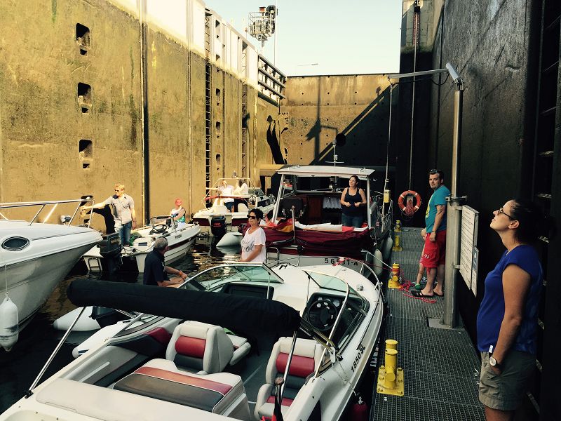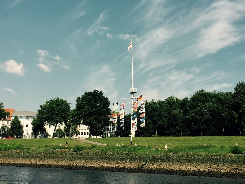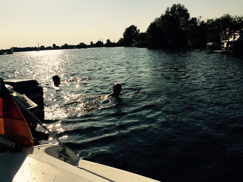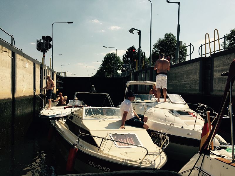 Samstag ging es mit dem Booten nach Bremen rein. Auf den Weg dahin passierten wir eine Tankstelle für Boote mit Benzin, eine Seltenheit in Deutschland. Bergab mit den Booten muss vor Bremen eine Schleuse passiert werden. Es gibt extra eine Kleinere für Sportboote. Nach ca. 1h waren wir durch und erreichten dann Bremen. Wir legten an der Marina Schlachte an, obwohl es voll war fanden wir einen Platz. Kosten für einige Stunden 3,5 Euro. 5 Minuten später ist man direkt in der City. Kleiner Tipp, man sollte nicht gleich eine Eisdiele an der Promenade nehmen. Auf den Rückweg mussten wir die große Binnenschleuse nehmen, da die Sportschleuse defekt war. Die Wartezeit der Boote war schon komisch. Im See angekommen, ankerten wir und schwammen erst einmal ein paar Runden. Wichtig ist aber, dass man(n) eine sehr lange Ankerkette hat, da der See teilweise über 20 Meter tief ist.