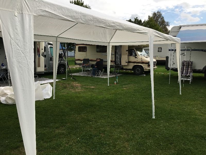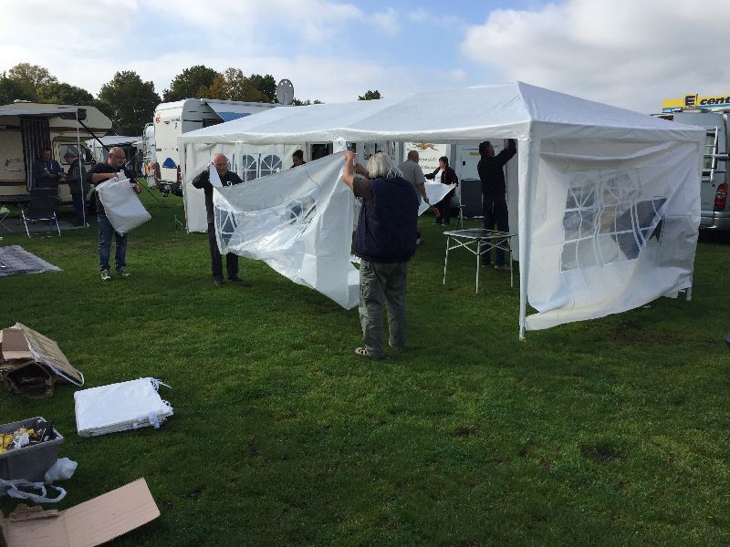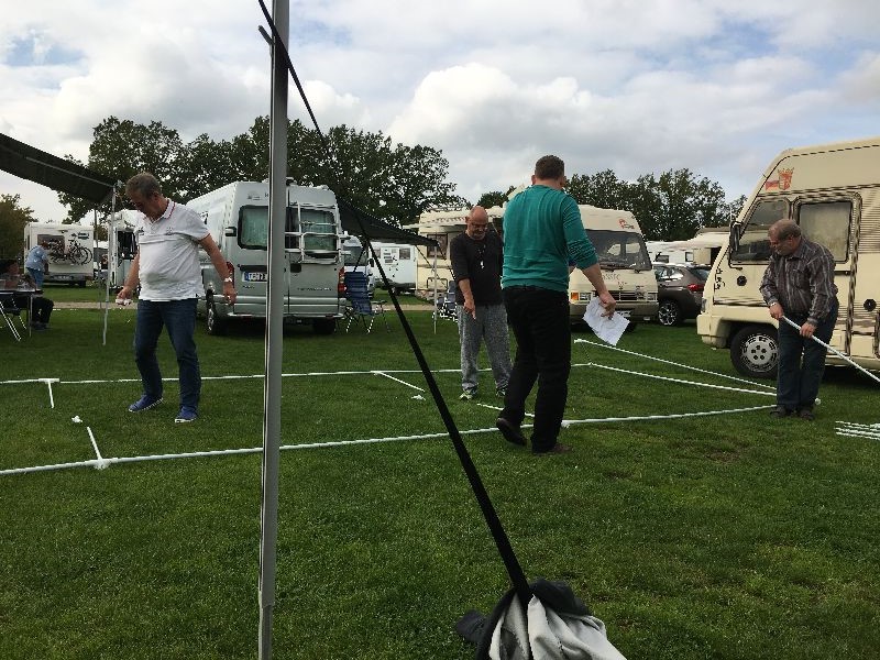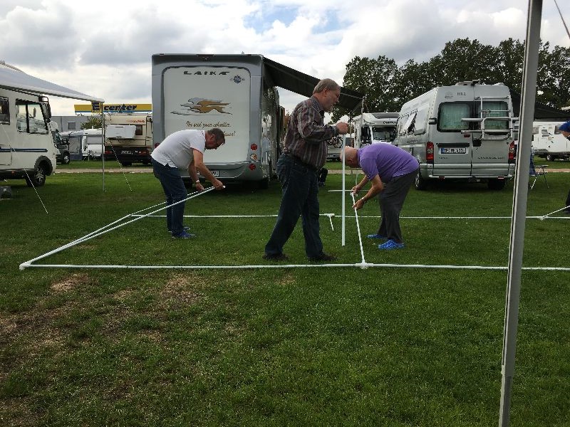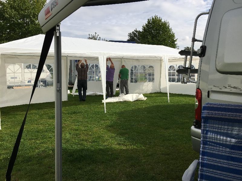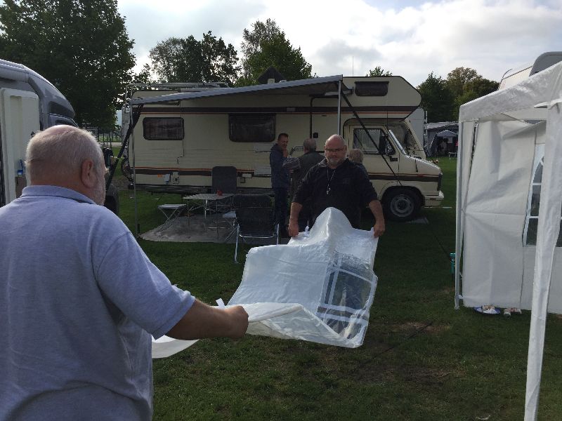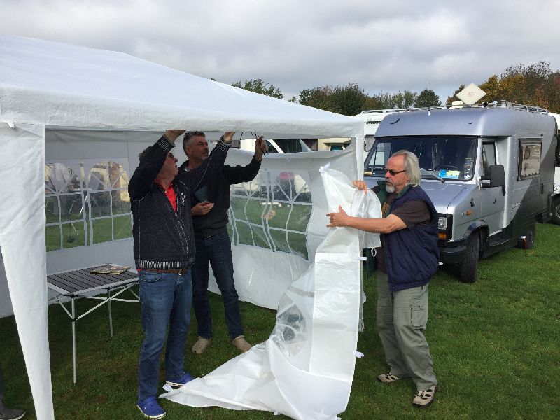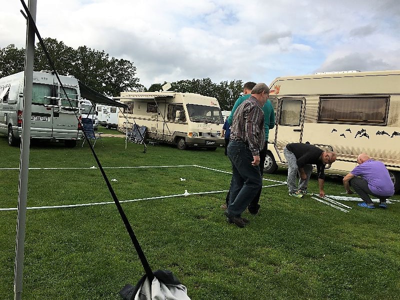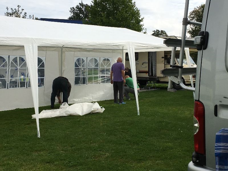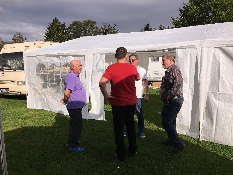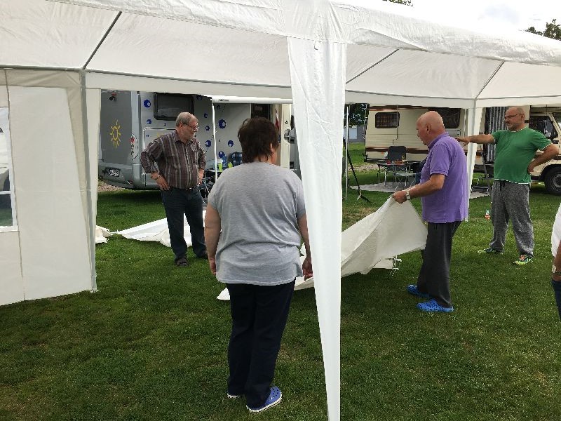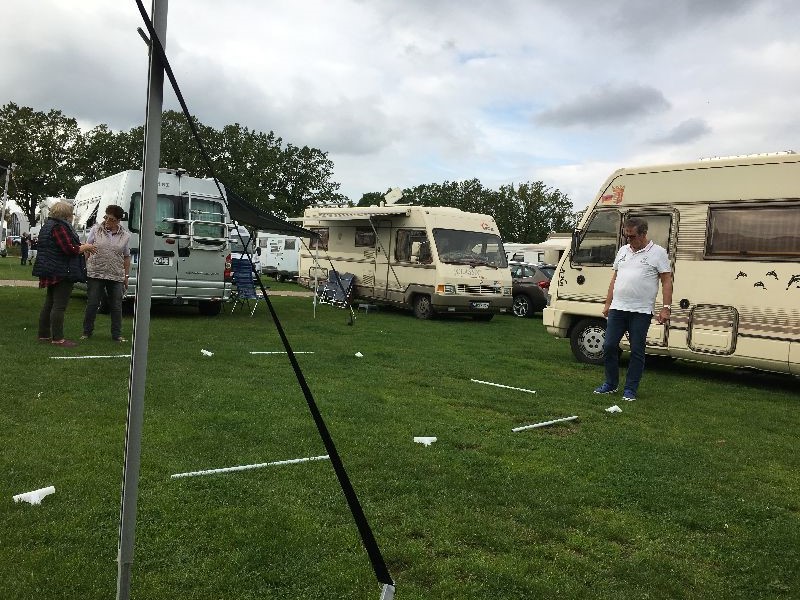 Schnell ging es ans Zeltaufbauen für das eventuell schlechte Wetter. Tatkräftig haben alle mit angepackt. Die Personen mit den grünen Oberteilen hatten immer alles im Blick. Nach und nach füllte sich der Platz, reserviert war für 13 Fahrzeuge, aber am Ende waren wir doch mit 18 Fahrzeugen auf dem Arenal. Trotz des Wetters stand einem gemütlichen Abend nichts im Wege.