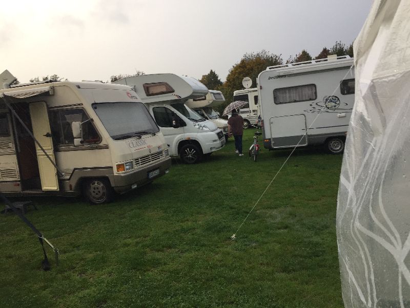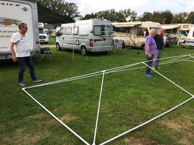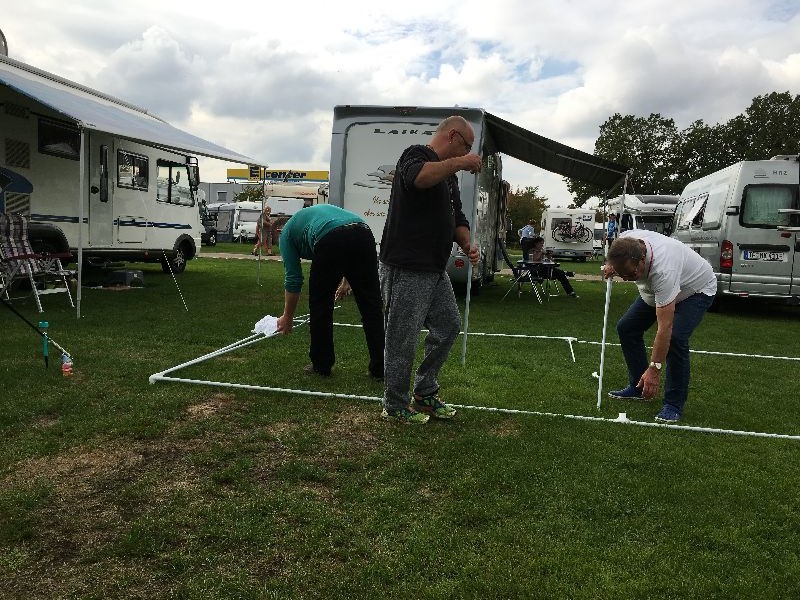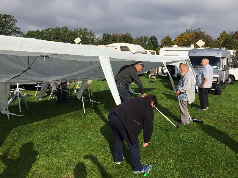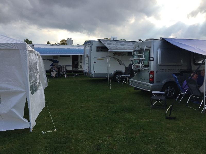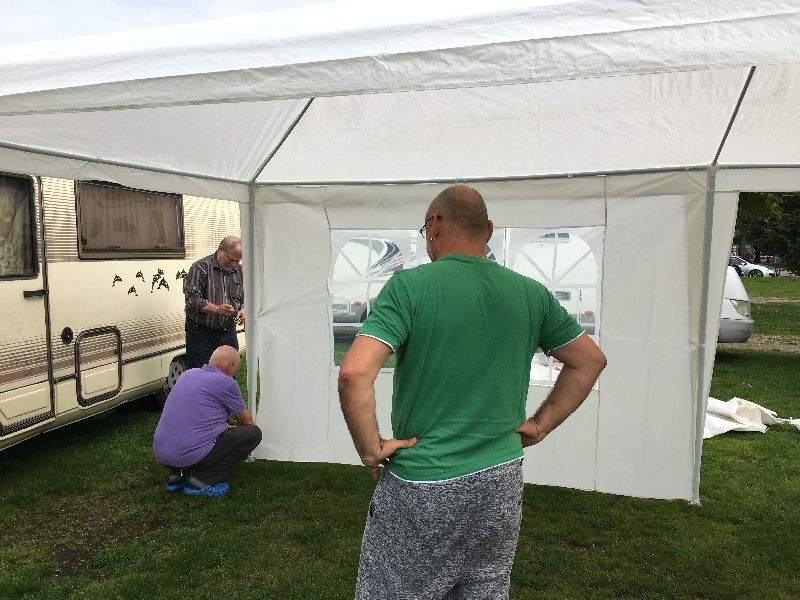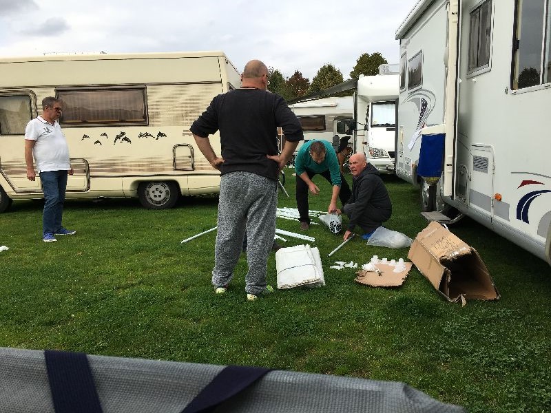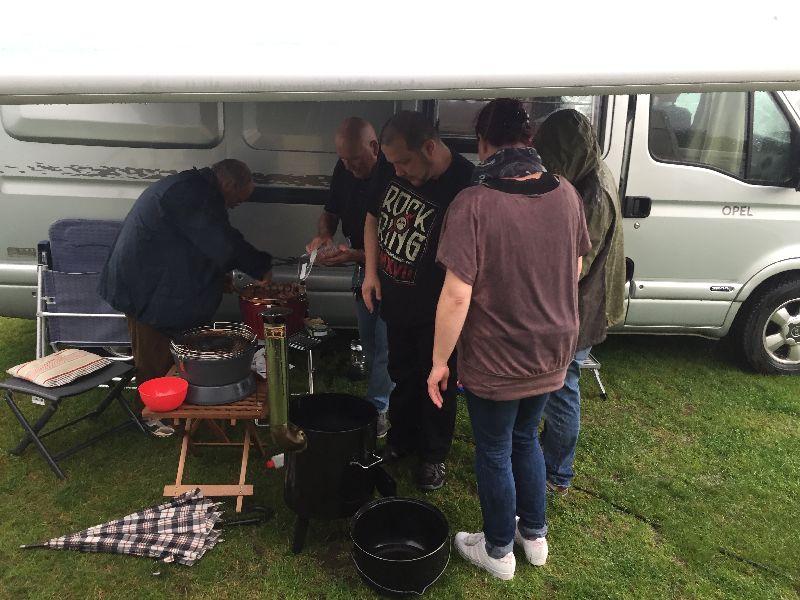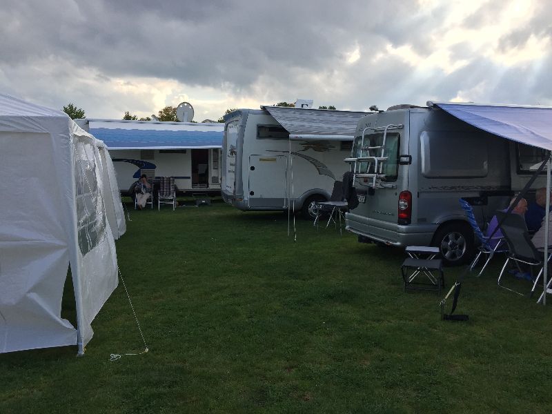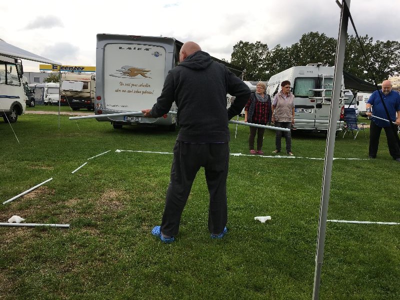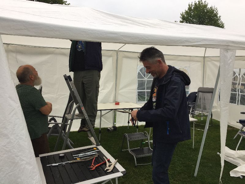 Schnell ging es ans Zeltaufbauen für das eventuell schlechte Wetter. Tatkräftig haben alle mit angepackt. Die Personen mit den grünen Oberteilen hatten immer alles im Blick. Nach und nach füllte sich der Platz, reserviert war für 13 Fahrzeuge, aber am Ende waren wir doch mit 18 Fahrzeugen auf dem Arenal. Trotz des Wetters stand einem gemütlichen Abend nichts im Wege.