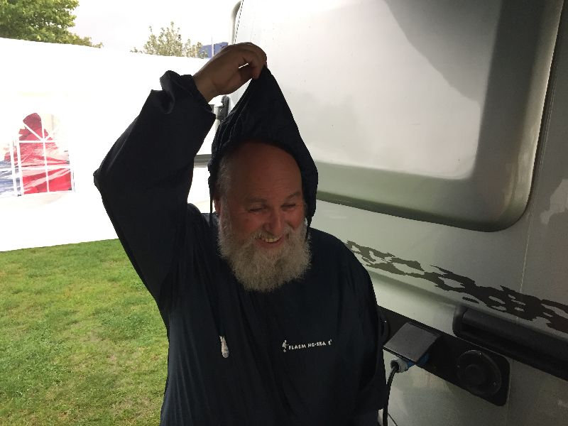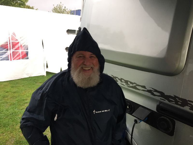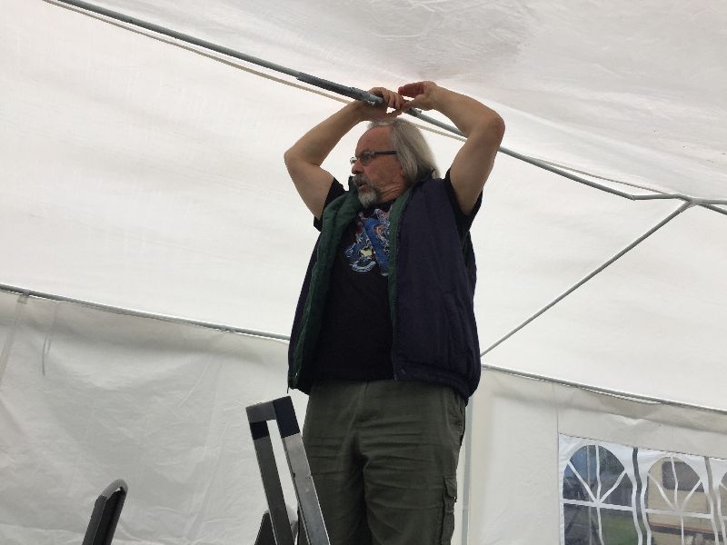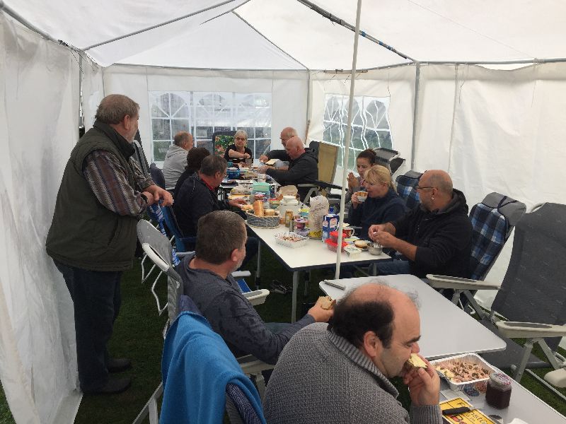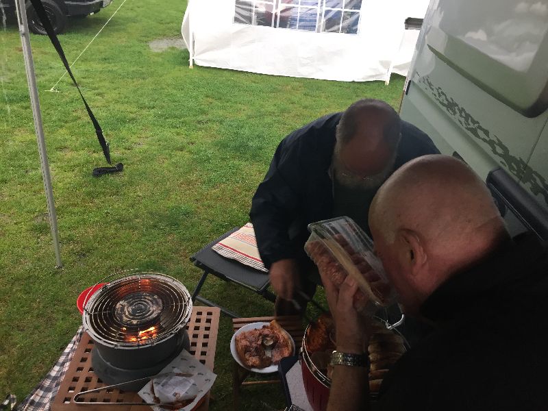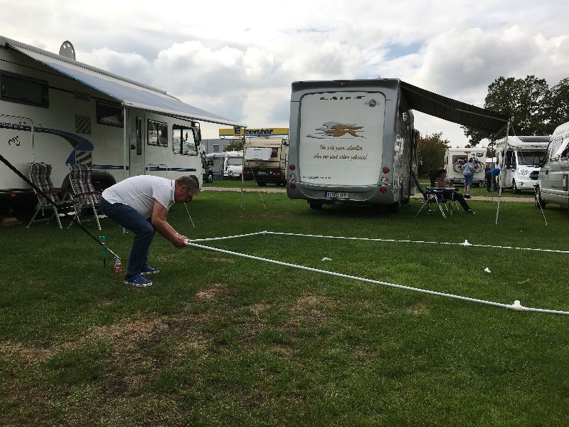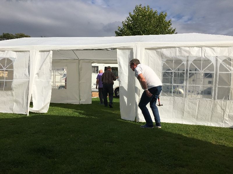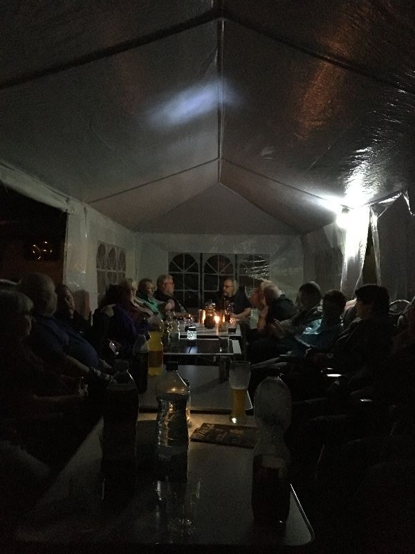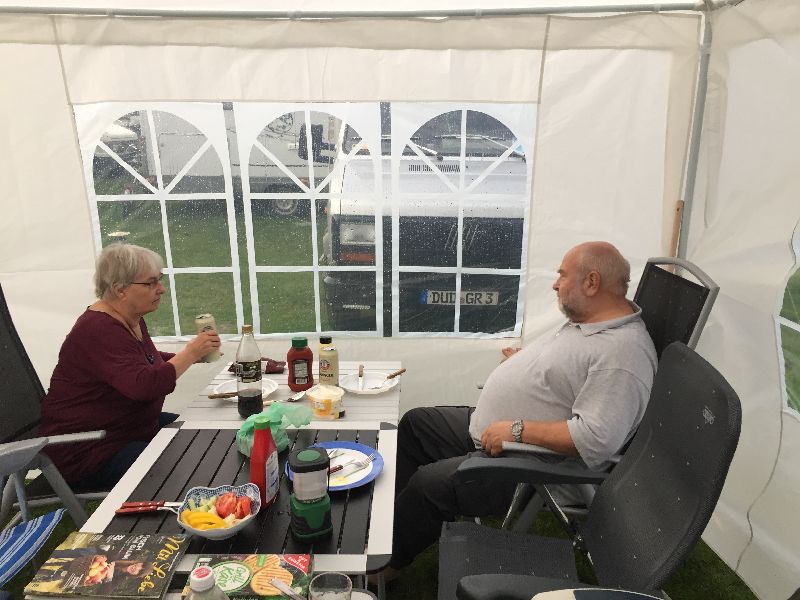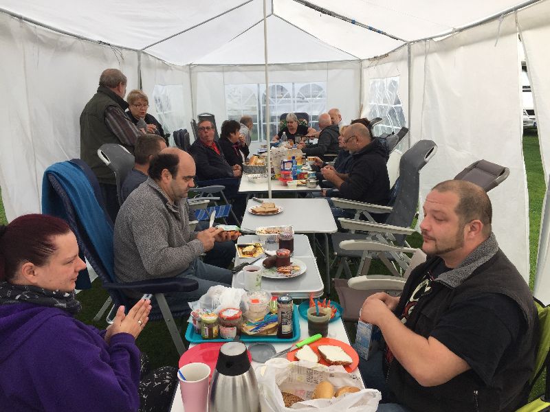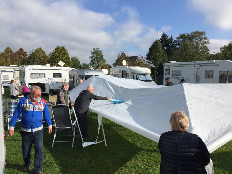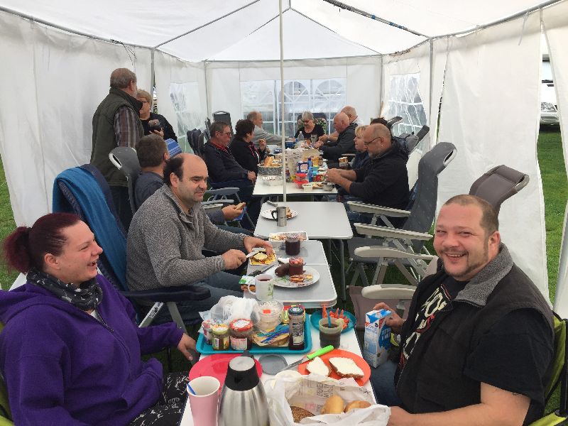 Schnell ging es ans Zeltaufbauen für das eventuell schlechte Wetter. Tatkräftig haben alle mit angepackt. Die Personen mit den grünen Oberteilen hatten immer alles im Blick. Nach und nach füllte sich der Platz, reserviert war für 13 Fahrzeuge, aber am Ende waren wir doch mit 18 Fahrzeugen auf dem Arenal. Trotz des Wetters stand einem gemütlichen Abend nichts im Wege.